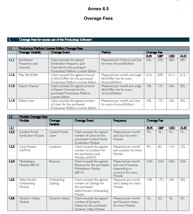 Client shall initially pay the Fees for the Services ordered in the applicable Order Form. In any month during the applicable Subscription Term that the Services used by Client exceed the agreed quantities as set out in the applicable Order Form, Client shall pay additional Fees for overage use as indicated in the applicable Order Form and Annex 6.5 to this Agreement. These Fees will be charged as Incidental Charges on a monthly base.